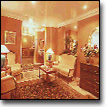 furniture . The rooms are large and decorated with velvet curtains.