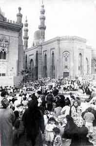 A PRIVATE GATHERING: Traditionally, the Husayniya order will follow any public function with a private gathering or council (majlis) to which only a few outsiders are sometimes invited. This majlis is held at the order's headquarters in Qaytbay. There are also twice-weekly ordinary meetings, which are equally private. Invited to attend, Johansen had a chance to observe this more informal type of meeting. The long, low building in which the gathering took place resembled a large carport with one end open onto the street, he narrates. Rows of chairs ran along the four walls and in the middle of the room facing each other. All the chairs were occupied by mostly older men. The younger ones sat between the rows. Everyone wore either galabiyas or suits with ties. There were several women sitting at the closed end of the building. Johansen estimated the number of attendees at 200. Tea was served to all.