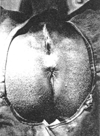 Pharaonic circumcision of girls, as it is practiced in Sudan, involves the excision of the clitoris, the labia minora and the inner, fleshy layers of the labia majora. The remaining outer edges of the labia majora are then brought together so that when the wound has healed they are fused so as to leave only a pinhole-sized opening. The resultant infibulation is, in effect, an artificially created chastity belt of thick, fibrous scar tissue. Urination and menstruation must thereafter be accomplished through this remaining pinhole-sized aperture (See photo).