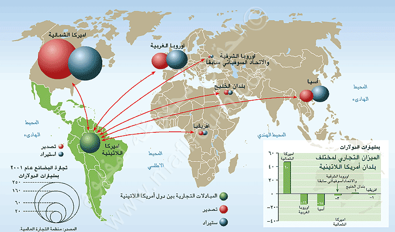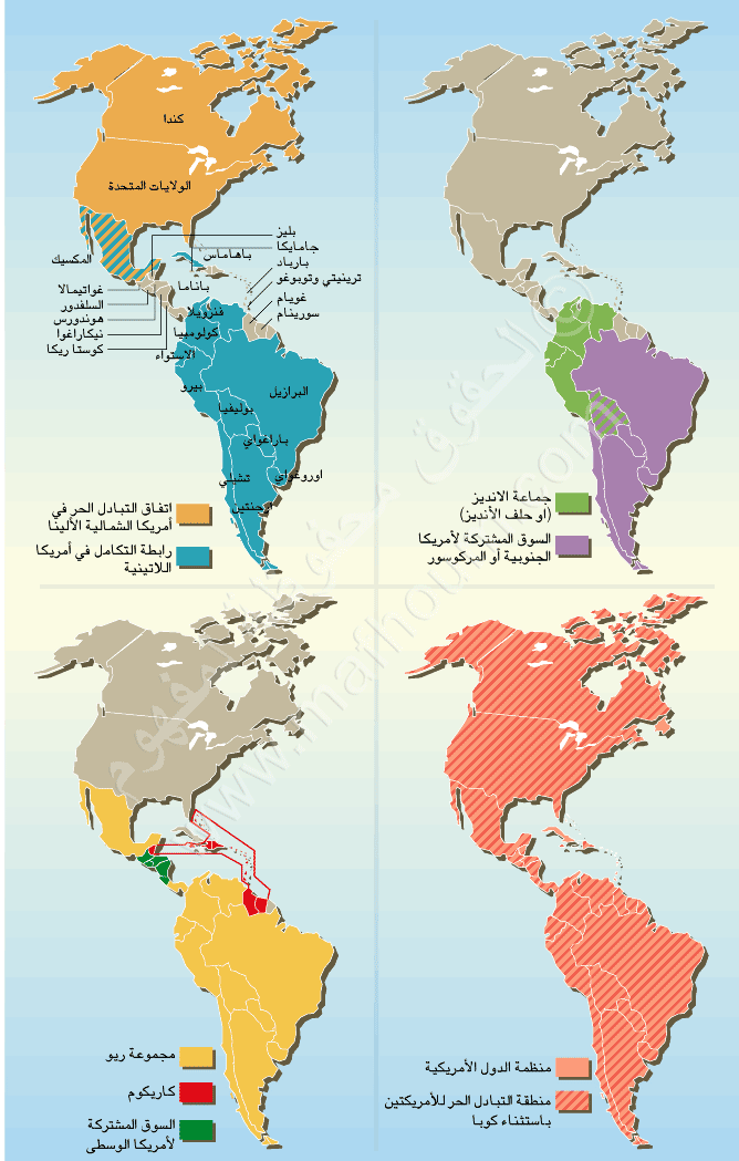 إذا تمكنت كل من كندا والمكسيك من الاستفادة من اتفاق التبادل الحر لأمريكا الشمالية (Nafta) فإن اقتصادهما بات مرتهنا أكثر من أي وقت مضى للولايات المتحدة. وتترقب دول أمريكا اللاتينية بحذر اقتراب موعد انشاء منطقة التبادل الحر للأمريكيتين (Zlea) عام 2005 والتي قد تقضي على محاولات التكامل الإقليمي.