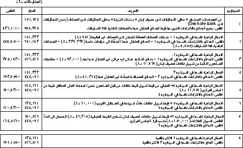 السيناريو 1 (الأسوأ) الذي يعتبر كل المطلوبات مستحقة، القيم التالية: