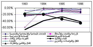 رغم التزايد الظاهري المستمر للإنفاق الاستثماري العام، إلا أنه لم ينعكس إيجاباً بما فيه الكفاية، حتى الآن، على الإنتاجية أو النمو أو توفير فرص العمل. ويكمن السبب في ذلك في تضافر العديد من العوامل نذكر منها: غياب السياسات الضريبية والنقدية الواضحة والتي تضمن وجود مناخ استثماري مشجع فعلياً ، واتباع سياسة انكماشية (واضحة في التسعينات). ويكفي النظر إلى الشكل 9 لرؤية الاختلاف الكبير بين الإنفاق الكلي المخطط له والفعلي في كل من القطاعات العامة الرئيسية: