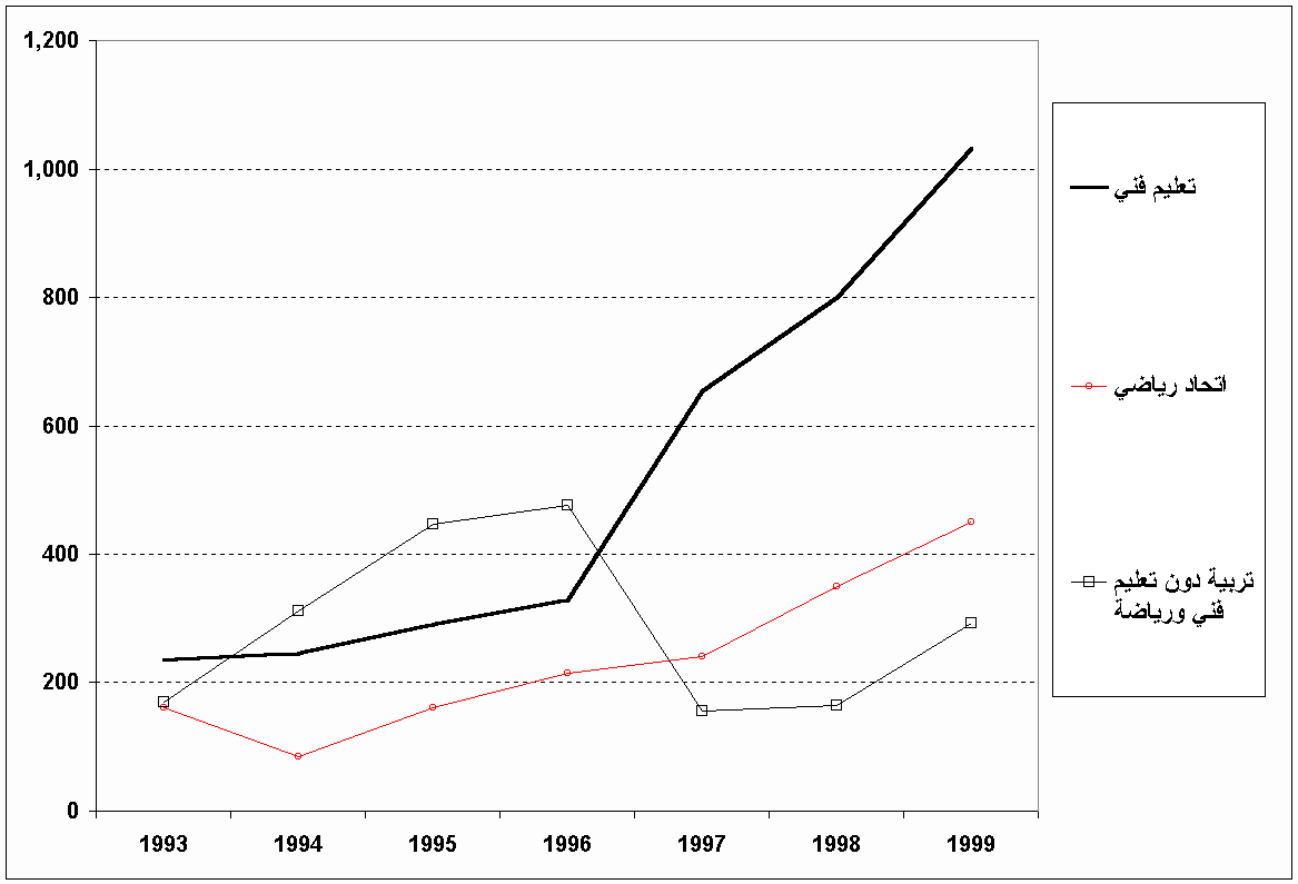 أما عند التمعن بتفاصيل الاستثمارات العامة لبعض القطاعات كالتربية مثلاً (الشكل 10)، فإننا نجد أن مجموع الاستثمارات في التربية (بدون التعليم الفني والتحاد الرياضي) قد انخفضت بشكل ملحوظ، وأصبحت استثمارات الاتحاد الرياضي أكبر بكثير من الاستثمارات في التعليم العام. كما نلاحظ تزايداً مستمراً في الاستثمار بالتعليم الفني.