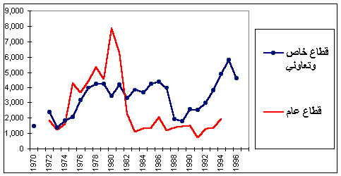 نلاحظ هنا كيف لعب القطاع العام دوراً مهيمناً في السبعينات في قطاع السكن. وترافقت زيادة استثماراته السكنية في تلك الفترة بزيادة مشابهة (ولكن أقل) من قبل القطاع الخاص والتعاوني الذي حافظ في النصف الأول من الثمانينات على نفس مستوى الاستثمار تقريباً، بينما تراجع القطاع العام عن دوره المهيمن في ذلك القطاع وعاد منذ النصف الأول من الثمانينات إلى تلك المستويات التي كان ينفذها في بداية السبعينات. وحافظ على تراجعه حتى بداية التسعينات. كما خفض القطاع الخاص والتعاوني من استثماراته السكنية بشكل ملحوظ بسبب الأزمة الخانقة التي عصفت بالبلاد في منتصف الثمانينات. وهكذا تجمعت العوامل اللازمة لنشوء فقاعة المضاربة في قطاع البناء، ومن أهم هذه العوامل: