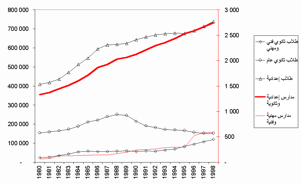 وجديرٌ بالذكر أن عدد طلاب المرحلة الإعدادية والثانوية العامة قد تزايد بنسبة 18% فقط بين عام 1985 وعام 1998؛ بينما تزايدت المدارس في نفس الفترة بنسبة 61%. وزاد طلاب الثانوية الفنية بنسبة 106% بينما زاد عدد مدارسها بنسبة 325%. جدير بالذكر أن بعض المدارس العامة تم تحويلها إلى مدارس فنية ومهنية. ونظراً لعدم توفر المعطيات عما تم تحويله أو بناءه أو استئجاره من مدارس فنية ومهنية جديدة، فإننا ننبه إلى الارتياب الكامن أو المحتمل في الأحكام الواردة في محاضرتنا.