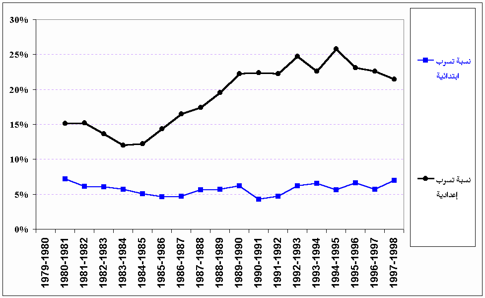 من الشكل 14 نجد أن التسرب من المرحلة الابتدائية مستقر بجوار نسبة 7%. وقد يعود السبب في ذلك إلى بعض التساهل في النجاح خلال هذه المرحلة. وتظهر نتائج إنجاح الطلاب غير المبرر في النسب المرتفعة في التسرب في المرحلة الإعدادية حيث ارتفعت النسبة من جوار 12% في بداية الثمانينات إلى ما يزيد عن 20% في التسعينات (26% عام 1995). وأما في المرحلة الثانوية فمن الصعب ضمن المعطيات المتاحة تقدير التسرب، فهناك الكثير من الجهات المعنية بالتعليم الثانوي (العامة والفنية والمهنية التابعة لوزارة التربية وجهات أخرى مثل فندقية، تمريض، سلكية وهناك أثر كبير للتحول في التوجهات التعليمية نحو التعليم الفني والمهني (قرار رئيس مجلس ا لوزراء 15/3/1988) على نتائج الدراسات. ونظراً لعدم توفر المعطيات فقد تجنبنا تقدير التسرب في صفوف التعليم الثانوي الفني والمهني (رغم تأكيد العديد من المطلعين على ارتفاع نسبته فيه).