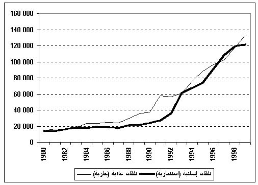 لقد انخفضت الاستثمارات "المتوقعة" في هذه الفعاليات بحدة عام 1997 لتعود عام 1999 إلى مستواها عام 1993. وعندما نذكر مرة أخرى بالفروق الحادة بين ما يخطط له وما يُنفق فعلياً، وبالتذكير بالتزايد السكاني، قد نجد شيئاً من فهم حقيقة تردي الخدمات الصحية العامة.